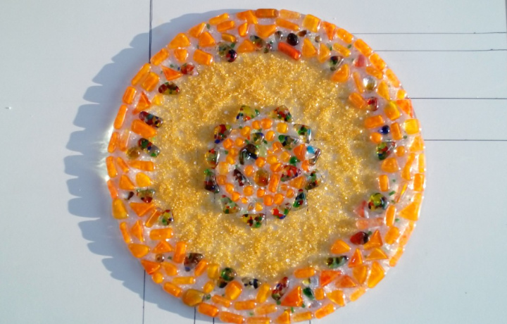 После экскурсии по мастерской и знакомства с техниками работы со стеклом мы с вами сделаем эскиз будущего панно. Затем из предложенных кусочков стекла и стеклянных камешков вы соберете свою композицию на круглой или квадратной основе. После засыпки фонов разноцветной стеклянной крошкой отправим ваше изделие в печь, где оно будет спекается в течение 20 часов при температуре 800-835 градусов, приобретая нужную форму, а кусочки стекла образуют неповторимый рисунок вашей фантазии.