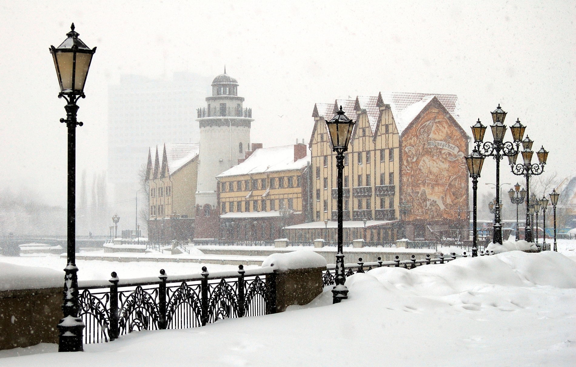 Посмотрим на скульптуру «Борющиеся зубры» и здание бывшего вокзала «Кранц». Увидим здание синагоги, Кафедральный собор, комплекс «Рыбная деревня», немецкую телефонную станцию и самый древний герб города Кенигсберг на здании.