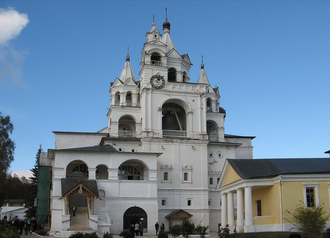 Звонница и церковь Сергия Радонежского занимают особое место в Саввино-Сторожевском монастыре. Это первая церковь, рядом с которой жил преподобный Савва. Деревянная конструкция, конечно же, не уцелела. Сегодня мы видим белокаменный храм, построенный в псковском стиле в XVII веке. Церковь венчает шатровый купол. Это самое высокое здание монастыря, видное из любой его точки.