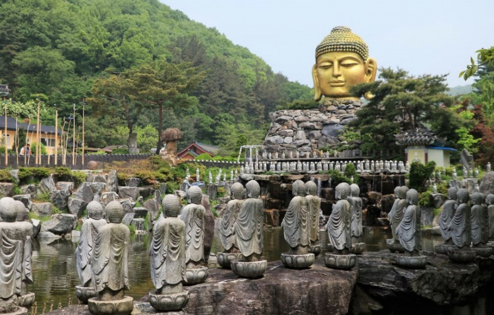 Буддийский храм Ваучхонса обладает особым великолепием и неземными пейзажами, которые трудно увидеть в других традиционных буддийских храмах Кореи. У входа в храм расположена 8-метровая голова Будды, установленная на каменной башне. В храме также имеется большое количество различных каменных башен, собранных из камней, привезенных из разных стран мира. Помимо этого, там можно увидеть около трех тысяч различных фигурок Будды из Мьянмы, Индии, Китая, Филиппин и т.д. Но особой популярностью это место пользуется благодаря деревянной статуе лежащего Будды, которая достигает 3 метров в высоту и 12 метров в длину. Благодаря этому деревянная статуя Будды вошла в Книгу рекордов Гиннесса.