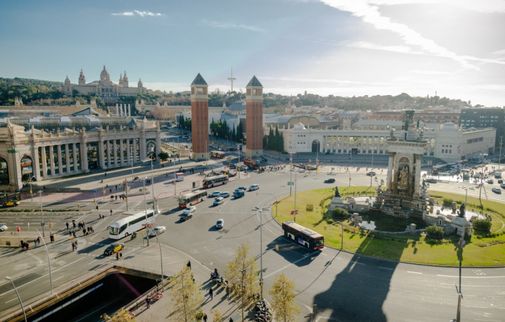 Мы начнём с самой большой площади Барселоны и второй по величине в Испании. Её построили ко Всемирной выставке 1929 года. Главным входом в экспоцентр служили венецианские колонны из красного кирпича — точная копия знаменитой Кампанилы Сан-Марко в Венеции.
