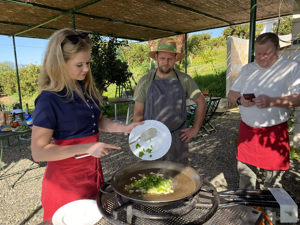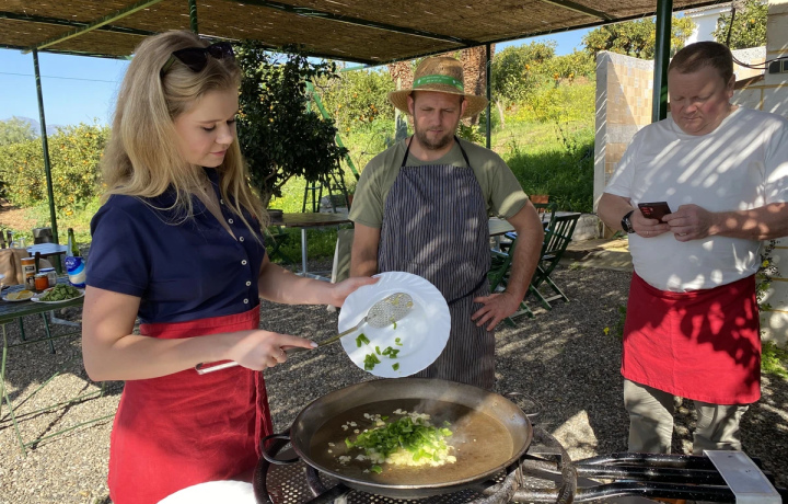 Сначала отправимся на древний рынок Малаги Атаразанас. По пути я коротко расскажу об истории этого места, а затем приступим к выбору свежайших ингредиентов для мастер-класса. Купим ароматный хлеб и овощи — я покажу, какие именно томаты годятся для вкусного гаспачо, — а также мясо или рыбу, в зависимости от выбранного вами вида паэльи (веганской, мясной, из иберийских колбасок или из морепродуктов, включая даже черную с добавлением чернил каракатицы). И после этого на машине отправимся на апельсиновую плантацию, что всего в тридцати минутах от рынка.