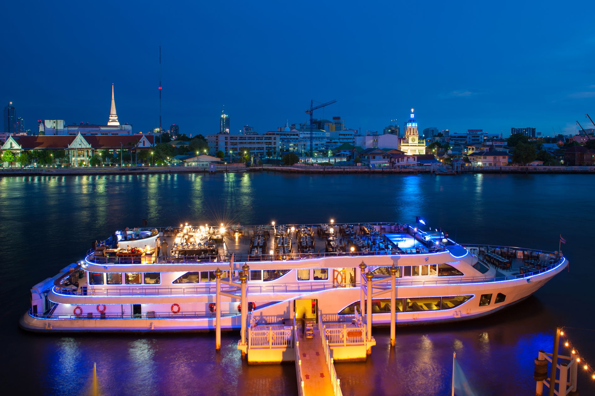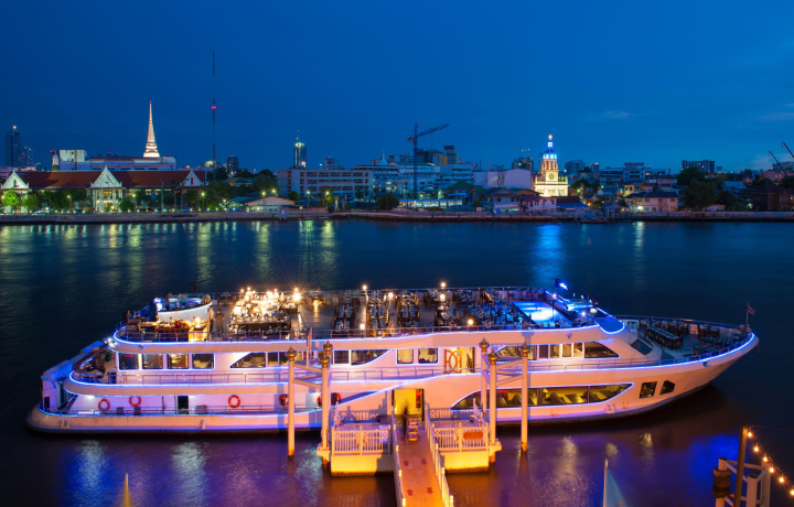 Теплоход Chao Phraya Princess отправляется в ночное плавание по реке Чаупхрая — мимо