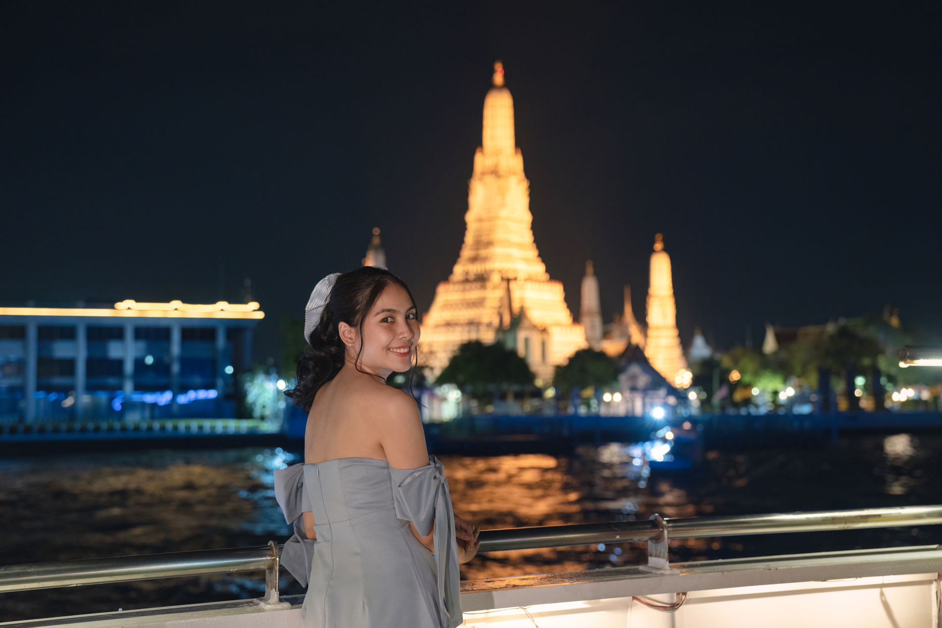 самых известных и священных достопримечательностей Бангкока. С воды город выглядит иначе: огни храмов, мосты и набережные создают атмосферу, которую сложно передать словами.