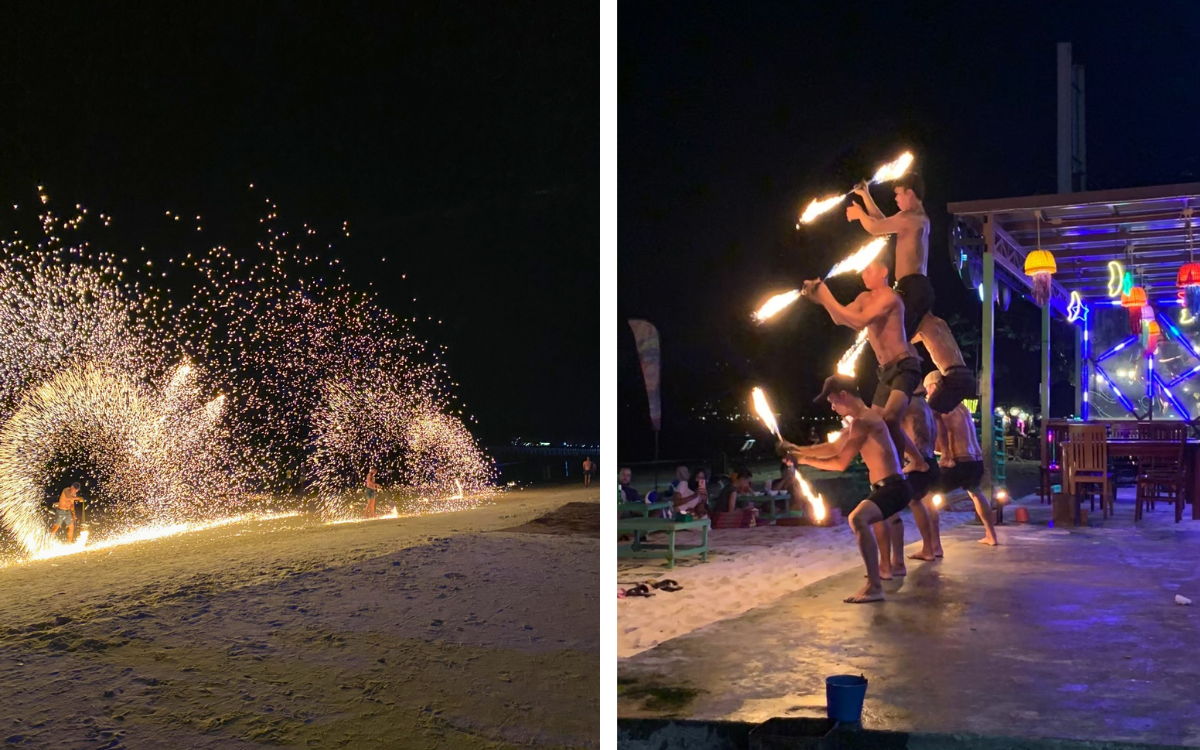 • Вас ждёт барбекю под звуки прибоя, искрящиеся огненные вихри и танцующие под музыку артисты. Отражения пламени на воде создают поистине волшебную атмосферу — это шоу невозможно забыть.