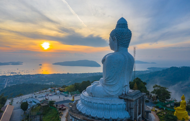 Рассвет на холме. Наше место назначения — вершина холма Наккерд. Здесь вас встретит 45-метровая статуя Будды, силуэт которой в предрассветных сумерках выглядит незабываемо. Вокруг — сонные джунгли с пением ранних пташек. И вот — первые лучи солнца из-за моря. Вы побудете в утренней тишине, полюбуетесь красками рассвета и видом на три пляжа — Карон, Ката, Ката Ной, понаблюдаете за проснувшимися обезьянками, сделаете фотографии.