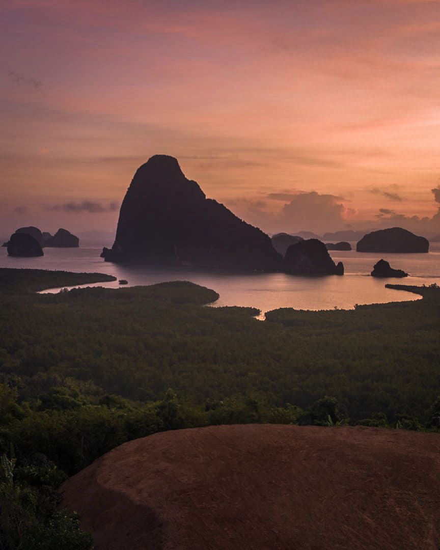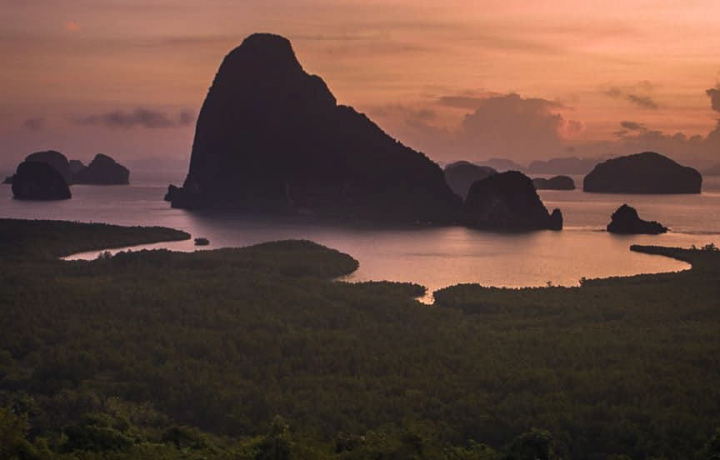 Затем мы поднимемся на одну из самых знаменитых смотровых площадок в мире — Самет Нангше. Отсюда, как с высоты птичьего полёта, вам откроется завораживающая панорама на бирюзовые воды залива Пханг-Нга, усеянные причудливыми скалами-карстами и ковром изумрудных мангровых лесов.