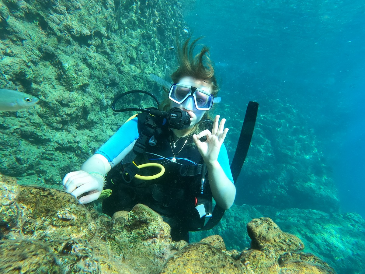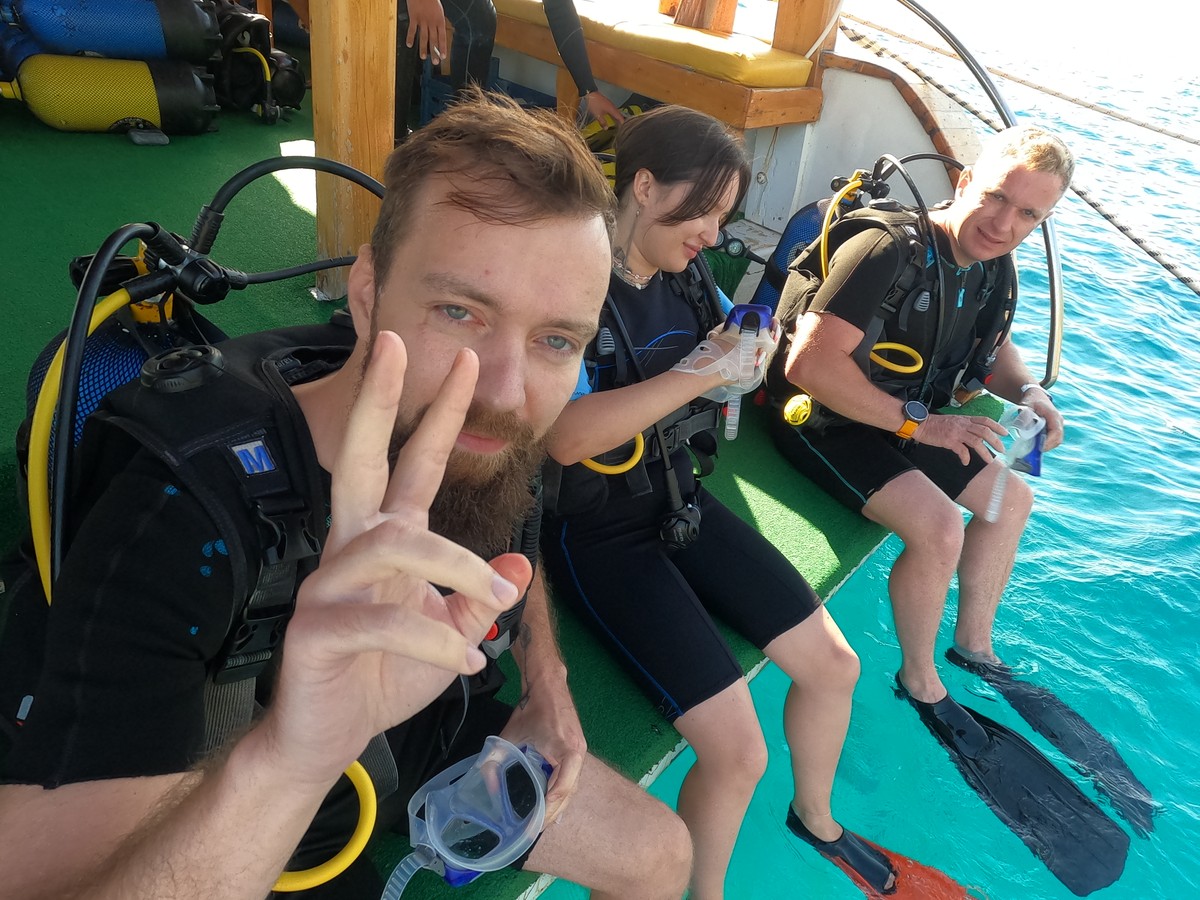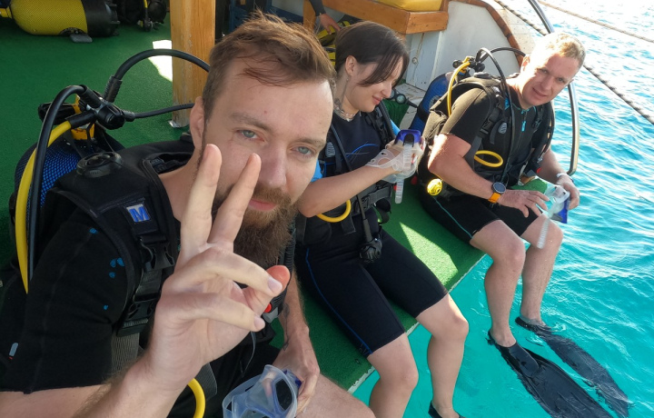 Группы небольшие — 4–6 человек на инструктора. Начинаете с комфортной глубины (5–7 метров) на 25 минут. Постепенно привыкаете к ощущениям, видите первые стайки рыб и морской ландшафт. Для фото и видео — работает фотограф (по желанию, за доплату).