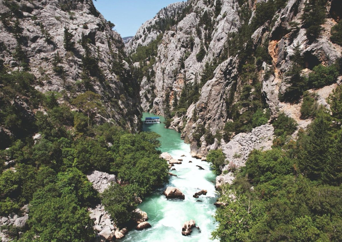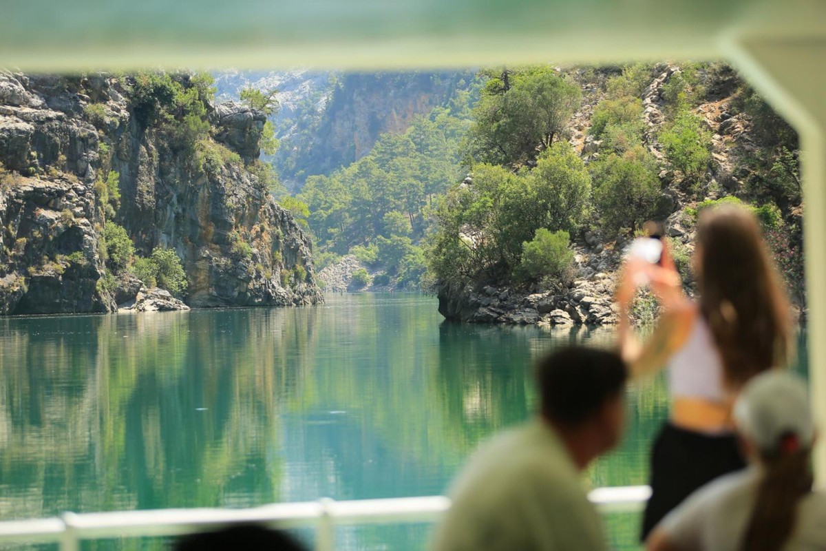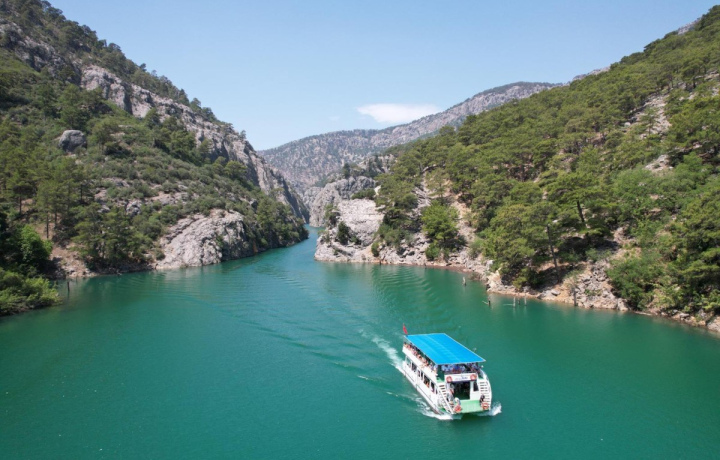 Мы заберём вас из отеля и доставим в заповедный Тавр. По пути вы увидите, как курортные ландшафты сменяются горными пейзажами. В Зелёном каньоне пересядете на катамаран и пройдёте по водохранилищу, окружённому крутыми скалами и густыми лесами. Вода в нём насыщенно изумрудная — очень фотогеничное место!