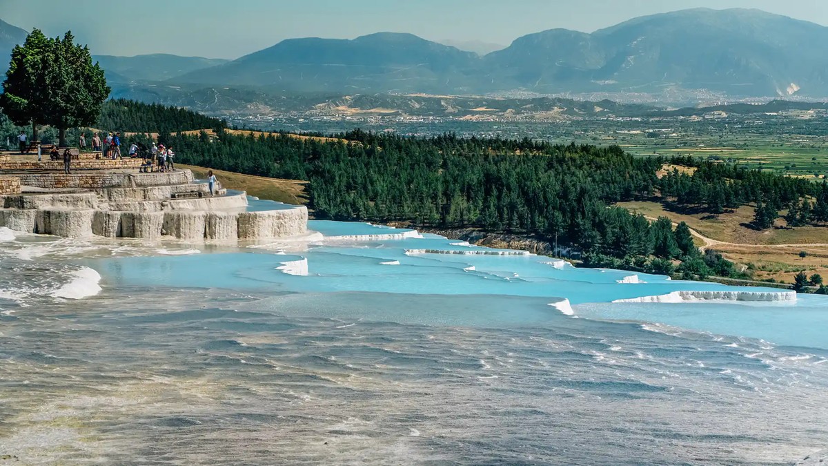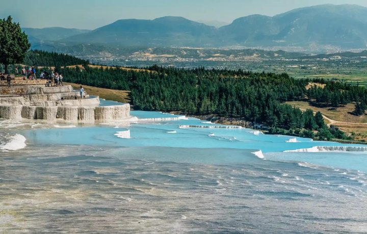 Памуккале. Вы окажетесь среди белоснежных террас. Их бассейны наполнены голубой водой, обладающей целебными свойствами: она расслабляет, дарит энергию и улучшает кожу.