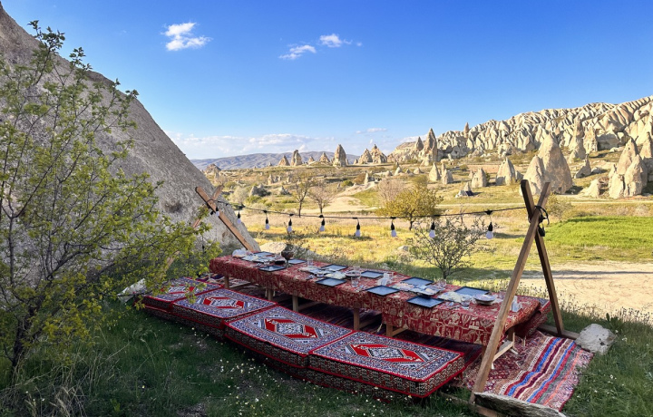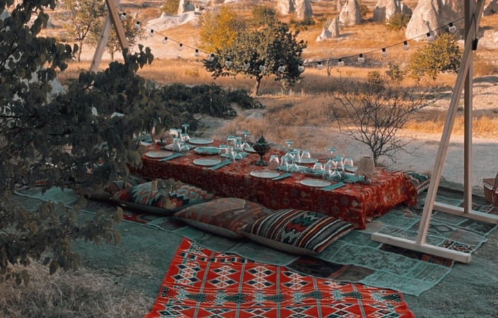 Мы заедем за вами в отель и привезём на комфортабельном авто в одну из самых живописных долин Каппадокии: Красную или Мечей. Там вас будет ждать накрытый на природе восточный стол с сезонным салатом, безалкогольными напитками и пятью видами закусок (хумус, таратор, бабагануш, шакшука и хайдари). Повар при вас пожарит на мангале ароматный шашлык, который прекрасно дополнит ужин.