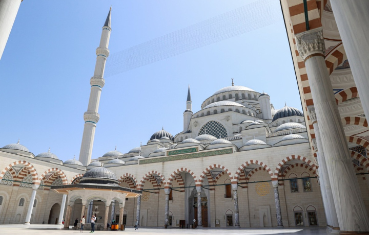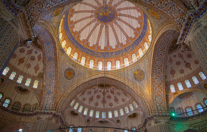 Величественная Голубая мечеть, или мечеть Султанахмет, как называют её турки, построена в первой половине XVII века. Мраморные стены отделаны традиционными для ислама голубыми изразцами с цветочными орнаментами. Вместо четырёх минаретов храм окружают шесть башен с балконами. Внутри молельного зала в подкупольных пространствах по кругу начертаны изречения из Корана.