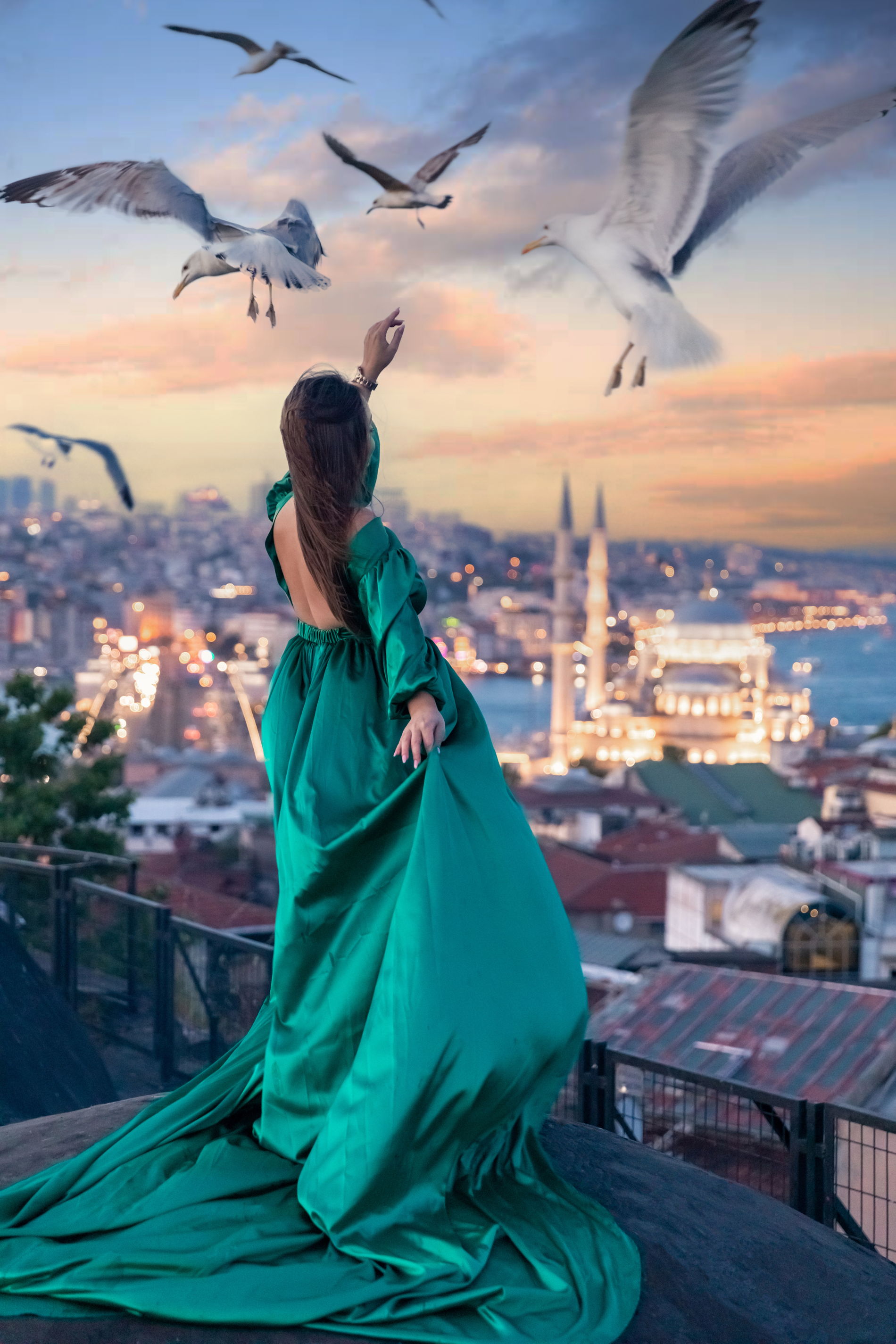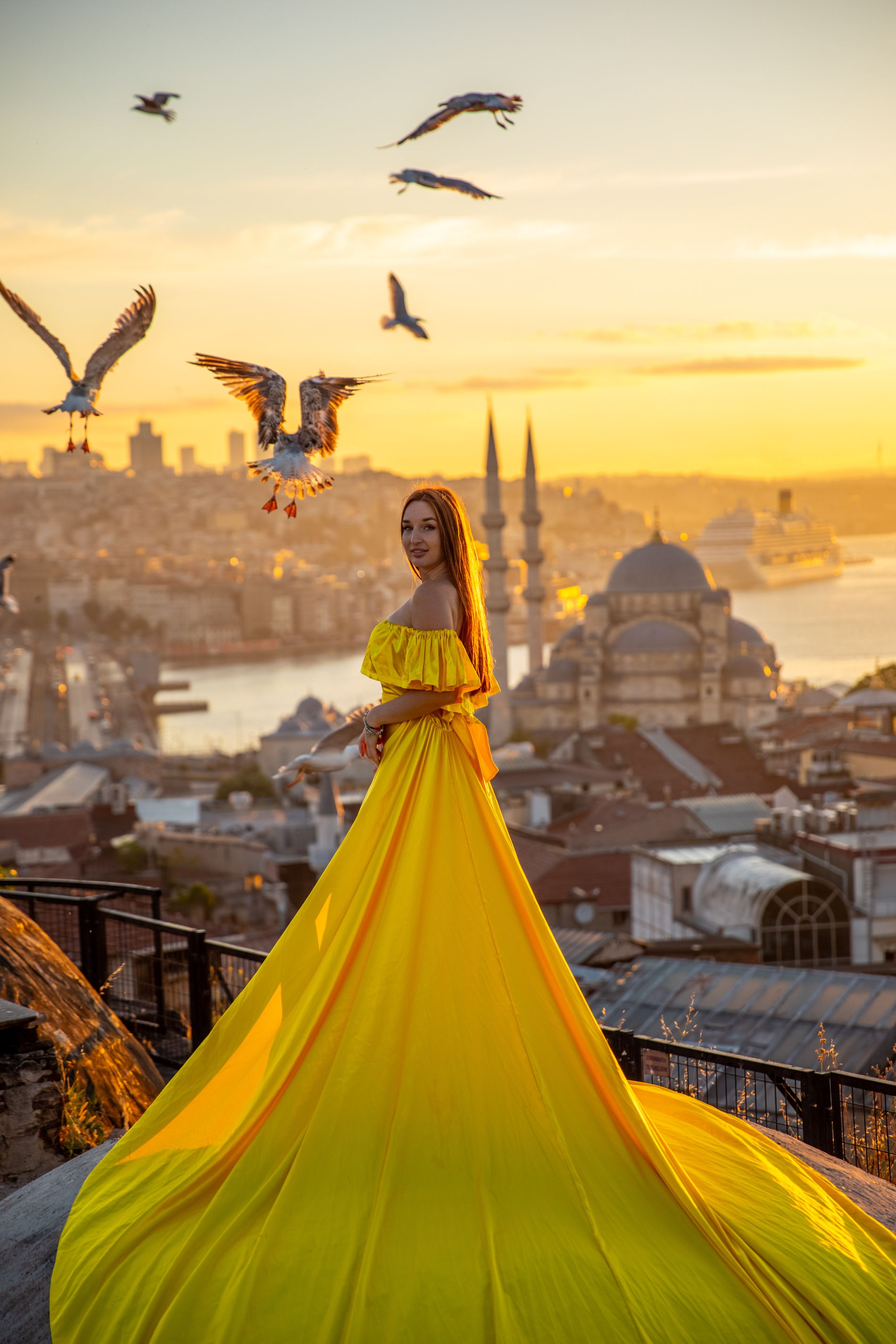 С крыши открывается невероятный вид сразу на 3 важные мечети города. Летающие чайки добавят кадрам нотку свободной романтики. Для съемки вы можете арендовать летящее платье.
