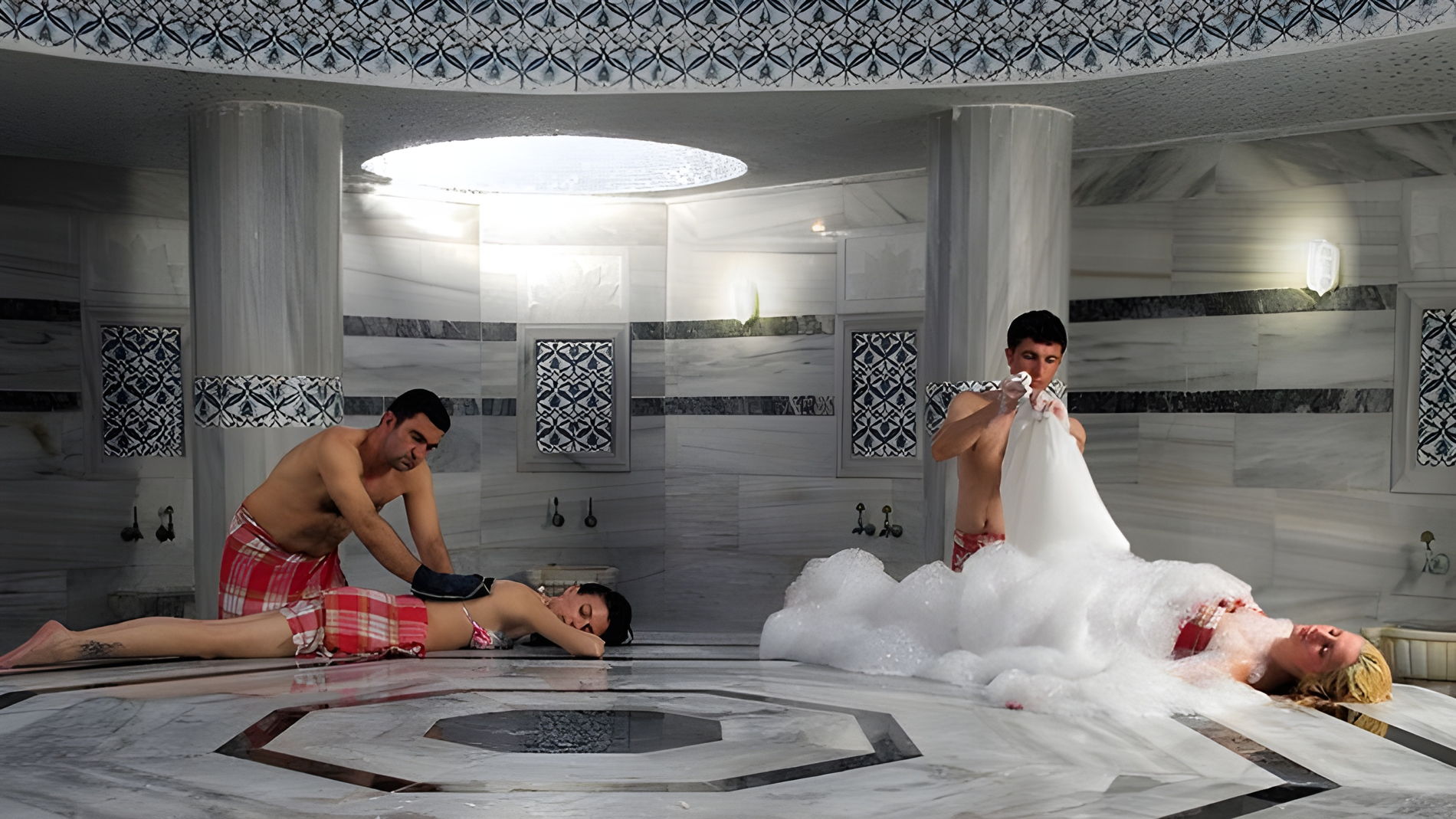 Мы приглашаем вас посетить традиционный хаммам, где вы сможете насладиться пилингом, пенным и классическим массажем, а также отдохнуть за чашечкой горячего чая, расслабиться в джакузи и поплавать в бассейне. К тому же, после посещения хаммама загар ложится на кожу намного ровнее и лучше!