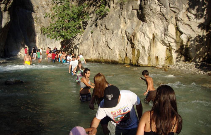 Первой остановкой станет каньон Саклыкент — одно из самых длинных и впечатляющих ущелий страны. Здесь вы сможете прогуляться по деревянным мосткам, пройти по мелководью прохладной горной воды и насладиться свежим воздухом среди высоких скал.
