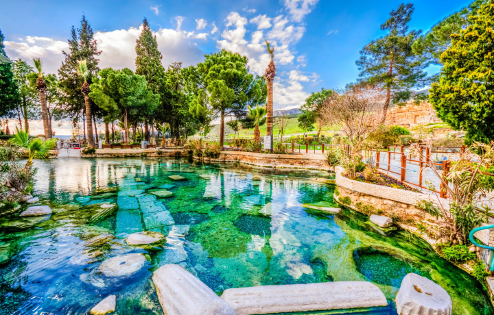 Особая часть путешествия — купание в легендарном бассейне Клеопатры. По преданию, сама царица наслаждалась целебными свойствами этих вод. Прозрачная вода, античные колонны под ногами и мягкое тепло создают атмосферу умиротворения и гармонии. Купание здесь — не просто развлечение, а настоящее прикосновение к истории.