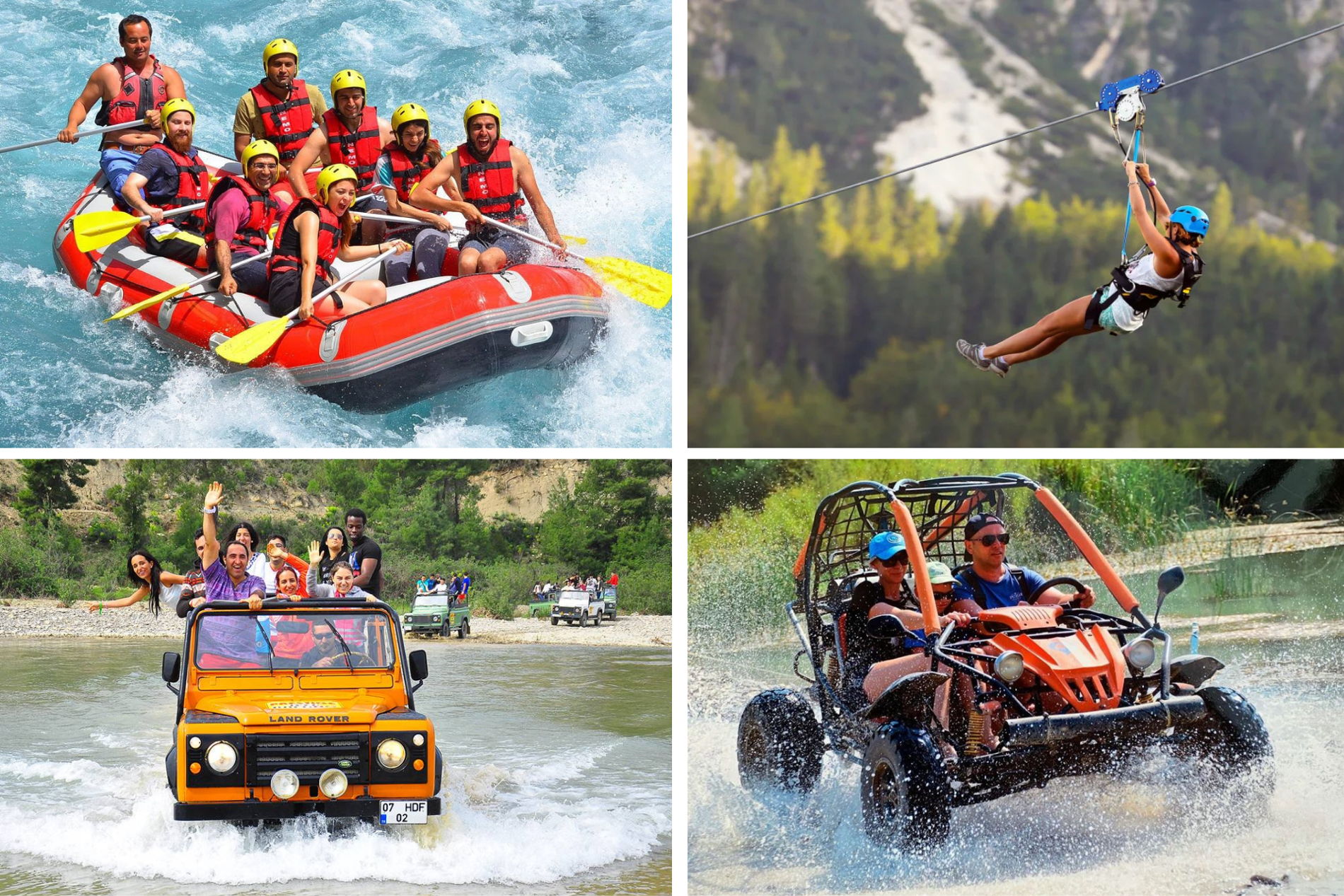 Этот комбо-тур из Сиде — идеальный вариант для тех, кто хочет совместить адреналин и развлечения. Рафтинг по горной реке, поездка на багги или ATV, полёт на зиплайне и захватывающее джип-сафари на природе подарят вам незабываемый день.