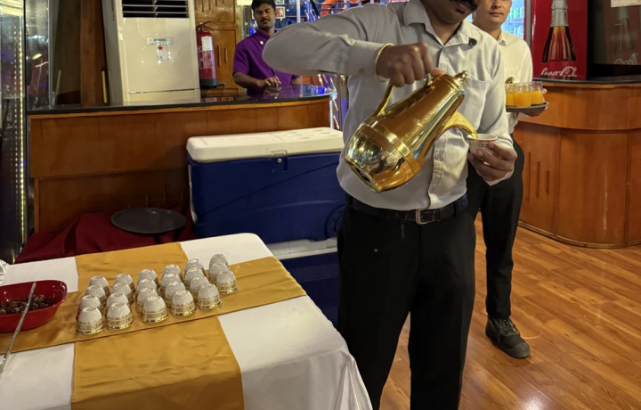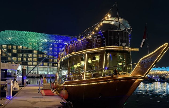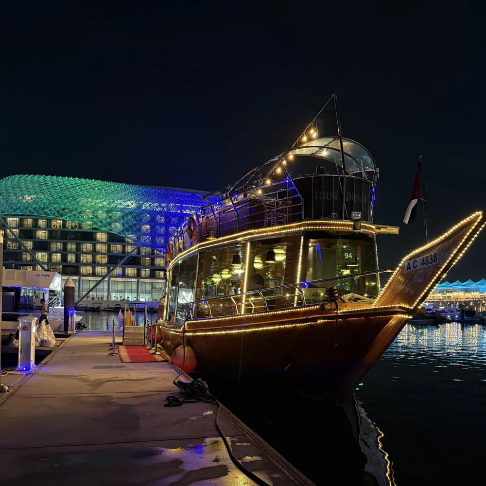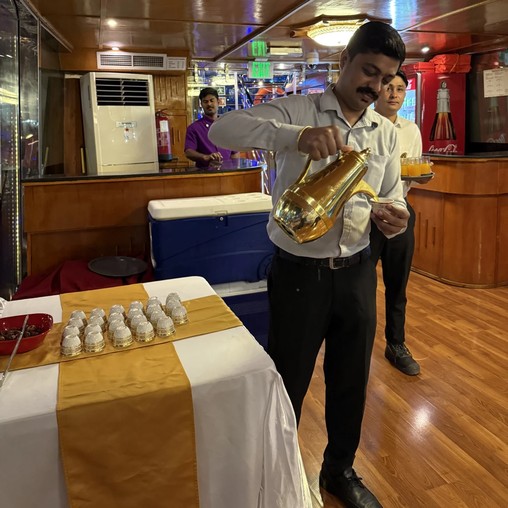 Вы поплывёте на двухпалубной традиционной арабской лодке доу — деревянном судне, которое веками служило основным морским транспортом региона. Сегодняшние кораблики сочетают аутентичный восточный колорит и современные удобства.