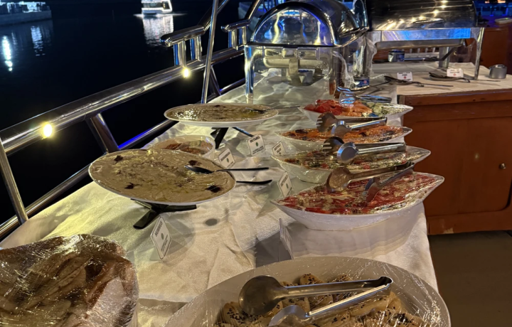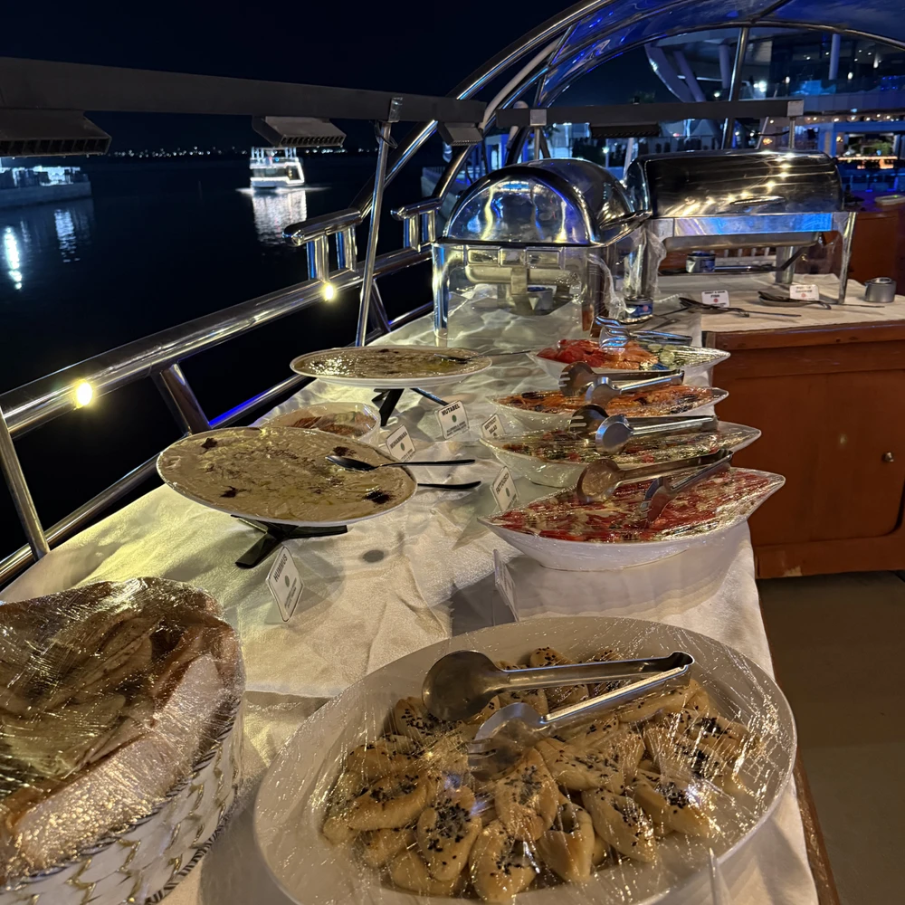 На борту вас ждёт ужин в формате шведского стола с блюдами интернациональной кухни, безалкогольные напитки и приятная восточная музыка.
