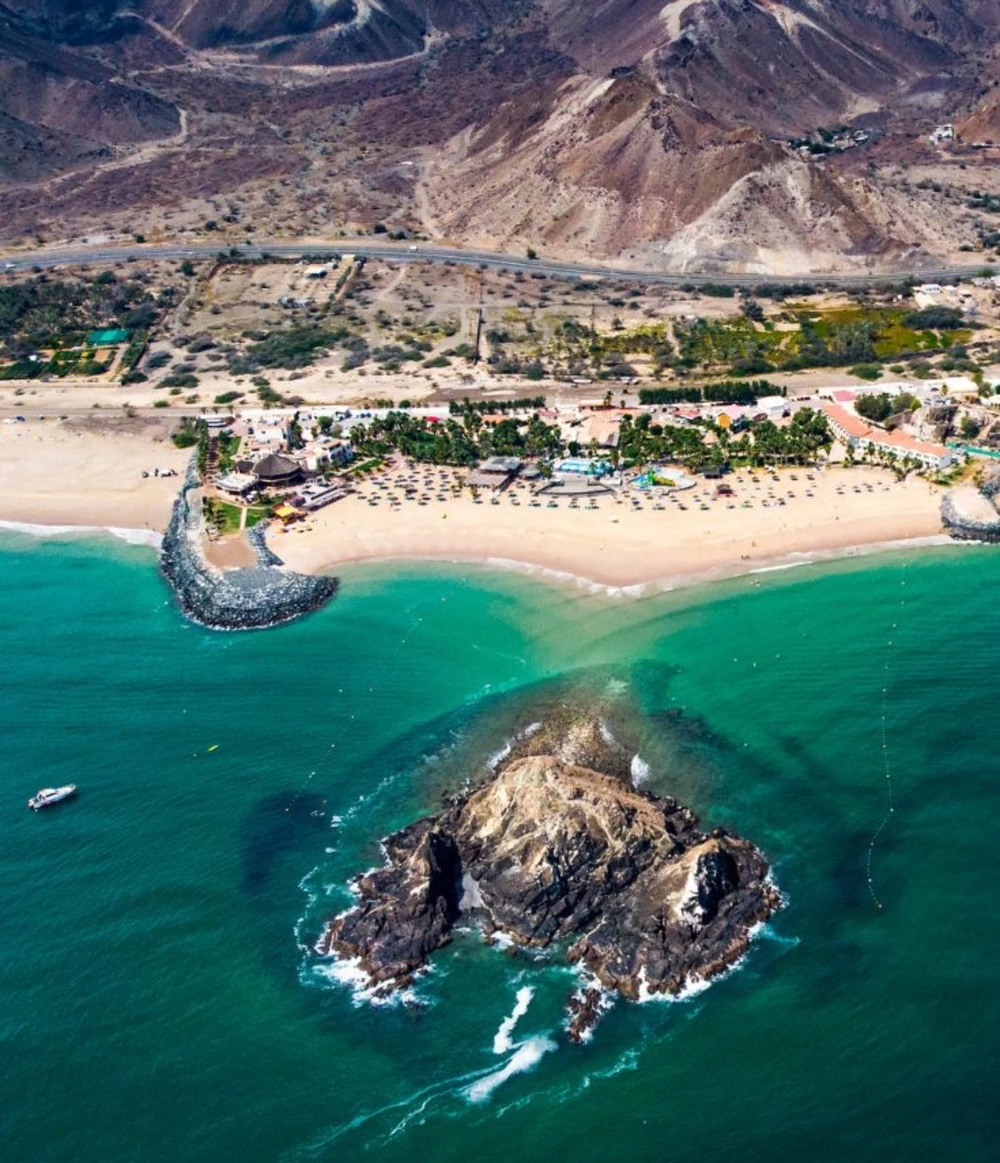 Отдых на пляже Фуджейры. Свободное время у побережья Оманского залива — купание, прогулка по берегу, фото на фоне бирюзовой воды.