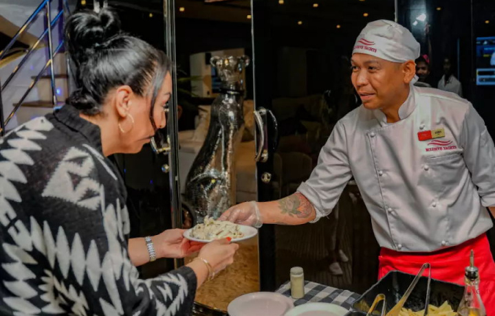 Сервис великолепный, в 15:30 запустили на яхту, ознакомиться походить изучить, объяснили некоторые моменты, угостили водичкой на входе, арома увлажняющие полотенца для лица и рук, 4 уровня яхты, провел все время на верху на круглом диване, напитки безлимит как и очень вкусные роллы, еда по меню в маленьких порциях на пробу, но этого более чем достаточно, первый час выход в сторону колеса и там можно поплавать недолго, мин 20-30, после направление в сторону паруса, все очень педантично в 4 вышли в 7 пришли, на подходе к причалу интересовались нуждаемся ли в такси, такси комфортное лексусы, но в 2-3 раза дороже обычного