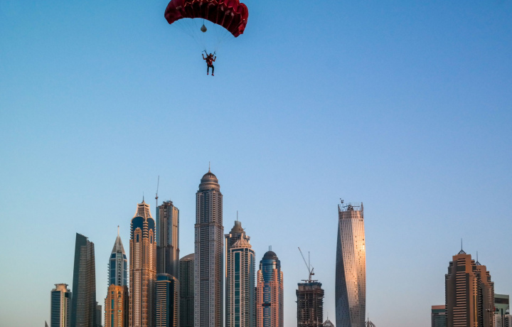 • Вы увидите, как парашютисты поднимаются в воздух или приземляются на взлетно-посадочной полосе Dubai SkyDive.