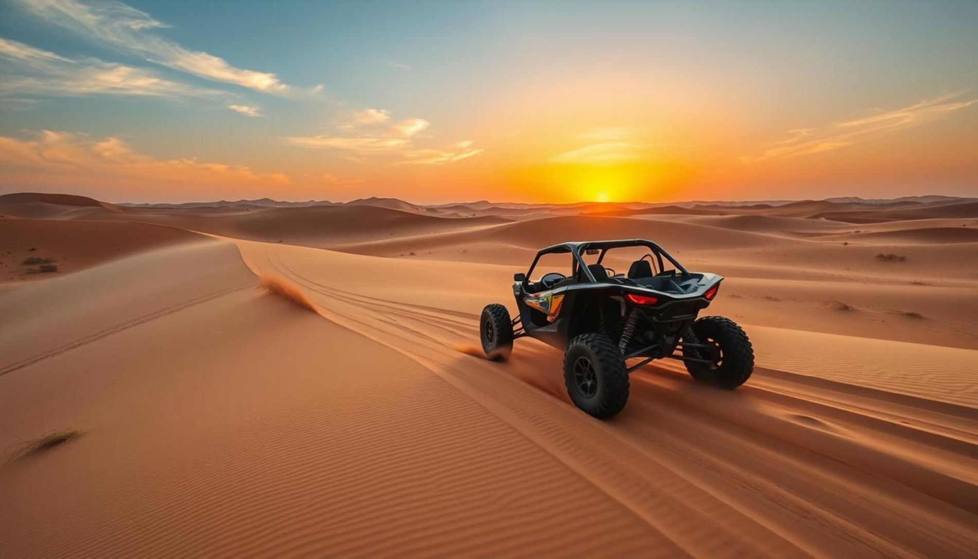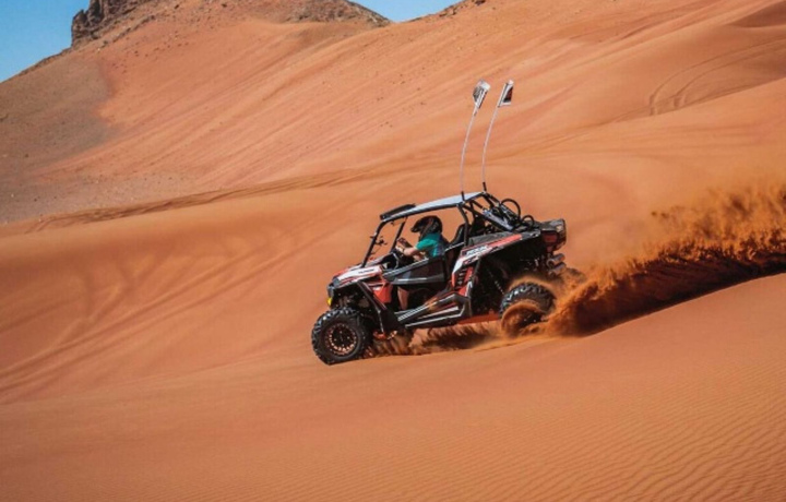 Короткий насыщенный тур на багги по песчаным дюнам Дубая. Прокатитесь по волнистым песчаным ландшафтам на мощном багги, который обеспечивает хорошую проходимость и контроль на сложном рельефе.