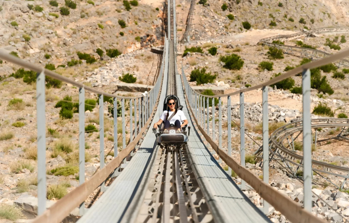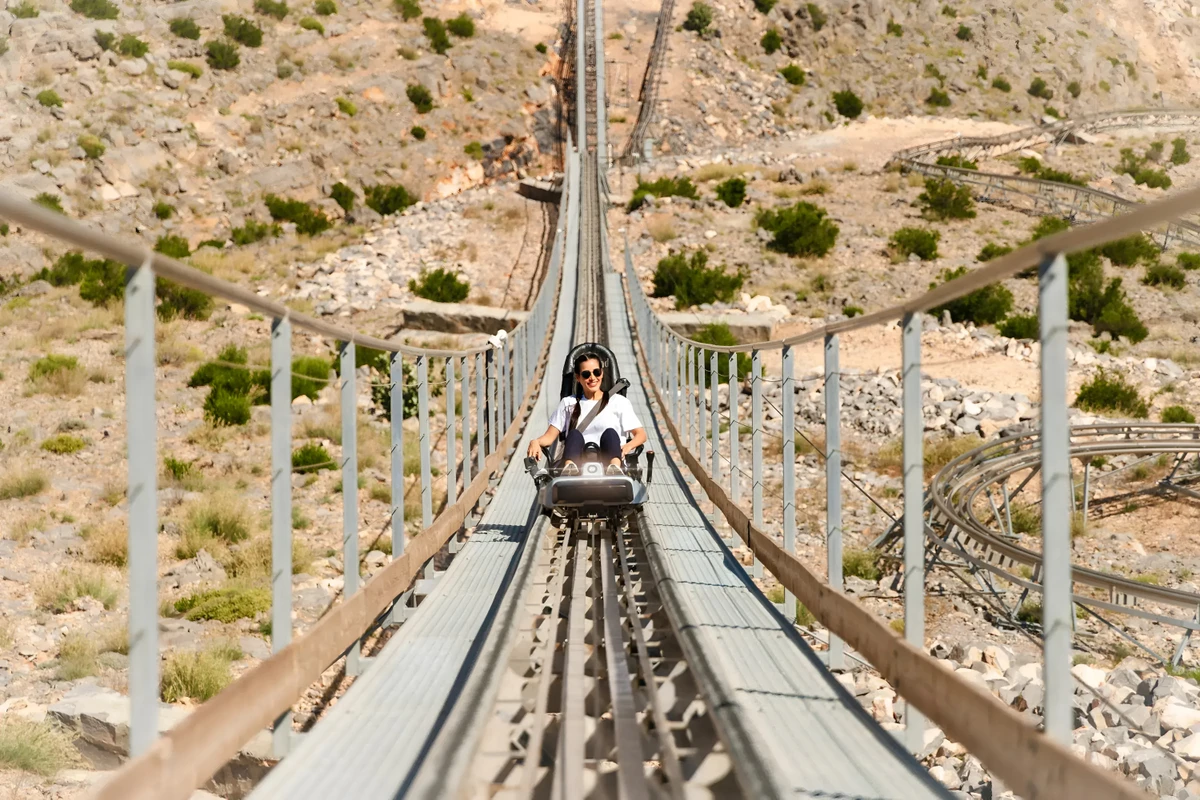 Катание на скоростной горной санной трассе. Виражи, перепады высот и скорость до 40 км/ч — безопасный, но ощутимый драйв.