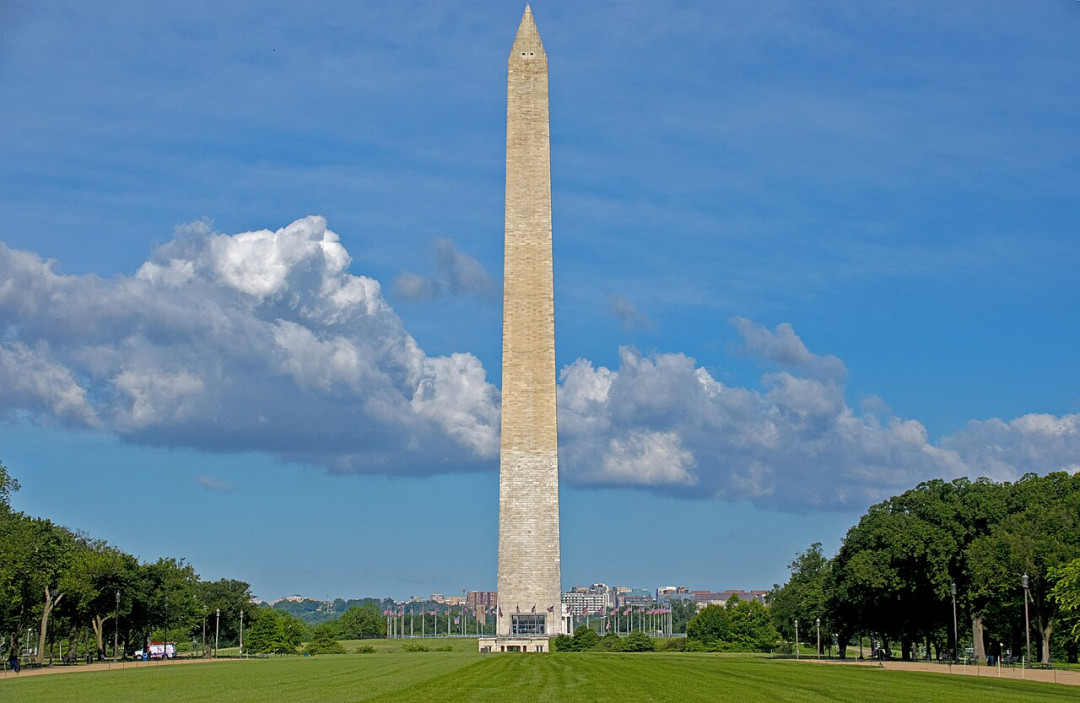 Монумент Джорджу Вашингтону воздвигнут в центре Эспланады на Национальной аллее между Белым домом и Капитолием. Возведение обелиска заняло более трёх десятилетий и закончилось в 1884 году. Полая колонна высотой 169 метров с пирамидальной верхушкой, облицованная мэрилендским мрамором, в то время стала самым высоким сооружением в мире. Основание стелы, установленной на круглом постаменте, окружают флаги американских штатов. Перед монументом простирается водная гладь Отражающего бассейна. В верхней части колонны расположена смотровая площадка с панорамным видом на город. Подняться к ней можно пешком по 896 ступеням или на лифте.
