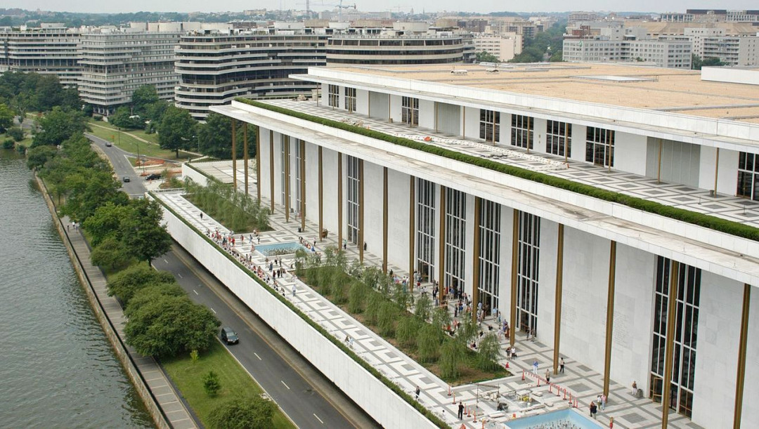 Центр исполнительских искусств имени Джона Кеннеди основан в 1971 году. Монументальное прямоугольное здание, построенное по проекту архитектора Эдварда Стоуна, протянулось вдоль реки Потомак на 190 метров. Центр вмещает три больших зрительных зала — Концертный зал, Оперный театр и театр Эйзенхауэра. Кроме них, в здании разместились Лаборатория театра, камерный Семейный театр и открытый Театр на террасе.