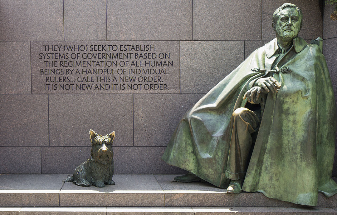 Мемориал Рузвельта — один из самых интересных памятников Национальной аллеи. Экспозиция, посвящённая 32-му президенту США, разделена на четыре части. Каждая из них посвящена одному из четырёх сроков правления Франклина Рузвельта. На гранитных стенах высечены изречения президента. Каждую зону оживляют скульптурные композиции и водопады. Мемориал Рузвельта — единственный, где есть изображение Первой леди. В центральной части установлен памятник самому президенту и его любимому псу — скотч-терьеру Фала. Широкий плащ скрывает инвалидную коляску Рузвельта.