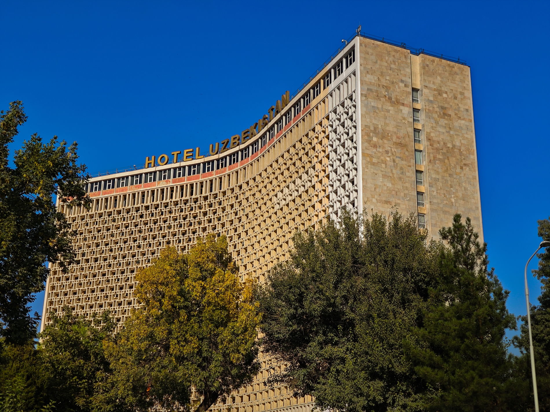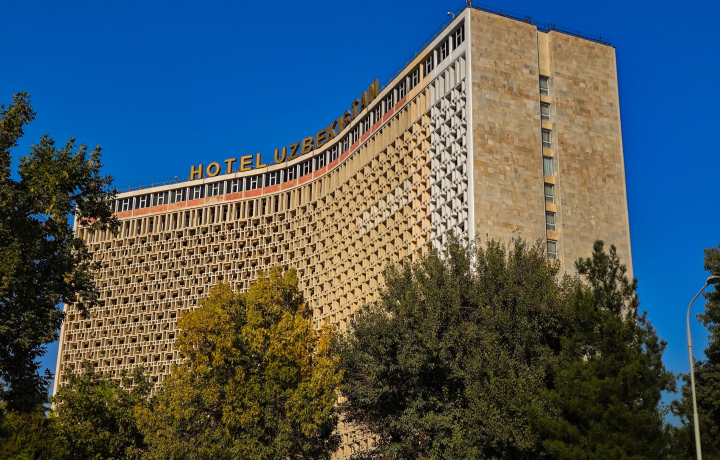 • Гостиница «Узбекистан». Один из элементов здания сразу бросается в глаза — это узорчатая солнцезащитная решётка, так называемая «панджара». Показательный образец «южного брутализма».