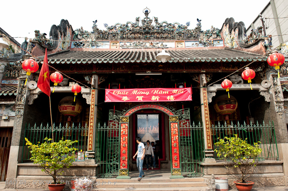 В китайском квартале Чолон стоит храм Тхиен Хау, посвящённый богине — покровительнице мореплавателей. Храм построен в 1760 году в лучших традициях архитектуры Поднебесной, но его первоначальный облик был сильно изменён в процессе нескольких перестроек. Стены и крыша сохранившегося здания украшены резьбой по дереву, бумажными фонариками, фарфоровыми статуэтками китайских божеств и мифологических персонажей. Внутри под потолком закреплена деревянная лодка, стены декорированы резными деревянными панно XVIII–XIX веков, фарфоровыми диорамами с изображением сюжетов из жизни китайского города XIX века. В алтаре установлена статуя богини Тхиен Хау. Над ним — три фигуры владычицы моря в разной одежде. Во внутреннем дворе стоят курильницы с благовониями.