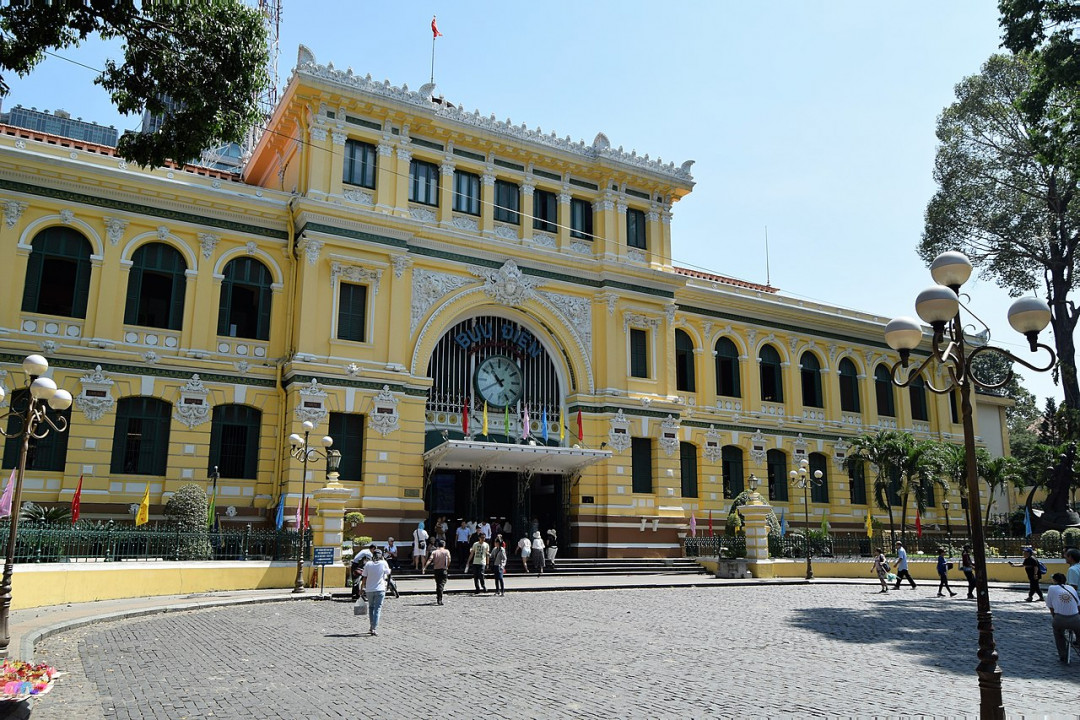 Здание главного почтамта Хошимина — яркий образец французского колониального зодчества, построенный в конце XIX века. Украшенный белоснежной лепниной фасад сочетает в себе элементы готики, ренессанса и необарокко. От центрального фрагмента отходят две галереи с многочисленными арочными окнами. Внутри высокие своды опираются на колонны. Пол выложен цветной плиткой. На центральной стене главного зала висит большой портрет Хо Ши Мина. В двух полукруглых нишах изображены две карты — Сайгона конца XIX века и телеграфного сообщения между Камбоджей и Южной Вьетнамом. Вместо дверей входы оформлены большими ажурными решётками. Центральное почтовое отделение оборудовано новейшими технологиями связи. У входа и в двух галереях работают магазинчики, торгующие сувенирами и ювелирными украшениями.