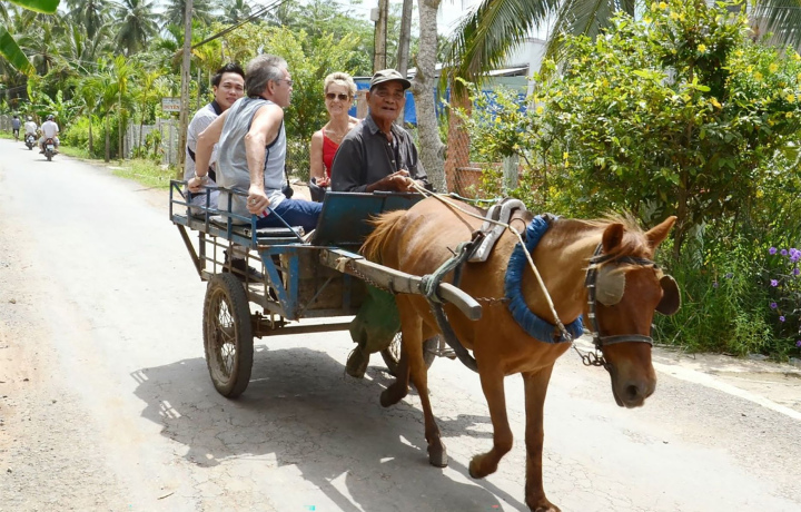 Во время экскурсии вы попробуете разные способы передвижения по дельте: прокатитесь на моторной лодке по широкой реке, затем на традиционной деревянной лодке по узким каналам под сводами пальм. По деревенским тропинкам вас прокатит конная повозка — так передвигаются местные жители между садами и фермами.