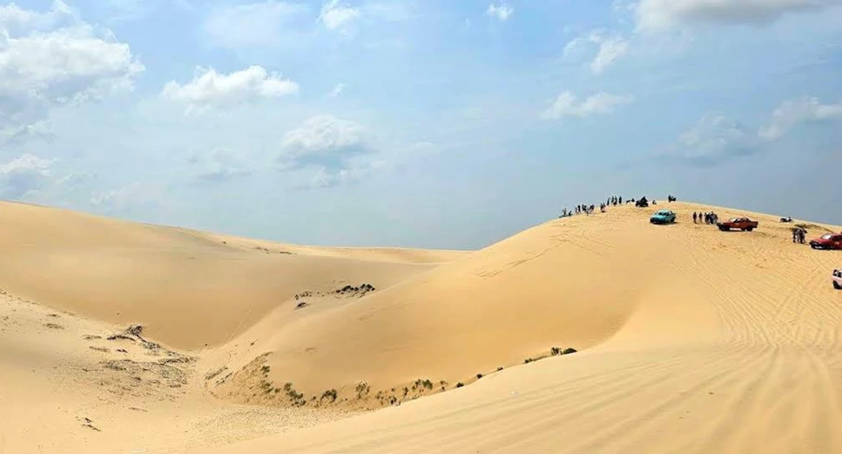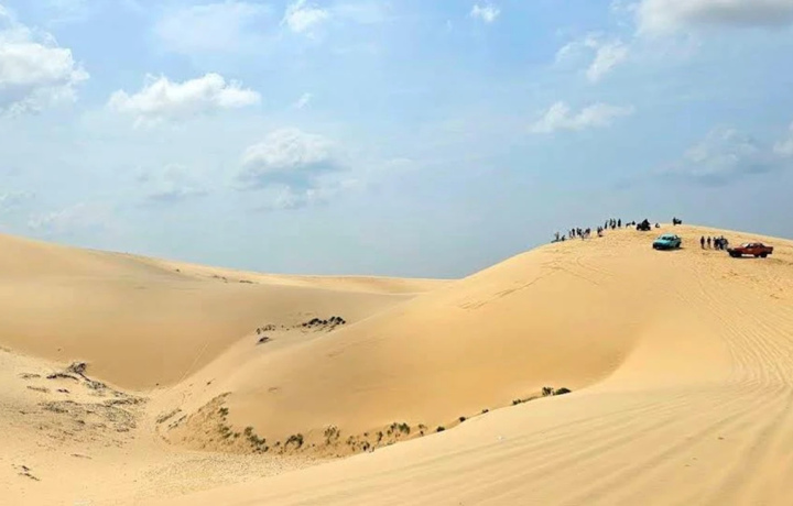 Белые дюны, часто называемые маленькой Сахарой Вьетнама. Это обширный массив ослепительно белого песка, который создает сюрреалистический пустынный пейзаж на фоне синего моря и неба.