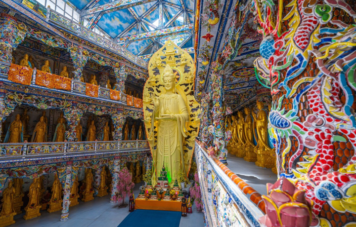 Уникальный храм с мозаикой из битого фарфора и 12 000 бутылок. Вы увидите 49-метрового дракона и статую Богини Милосердия из цветов бессмертника.