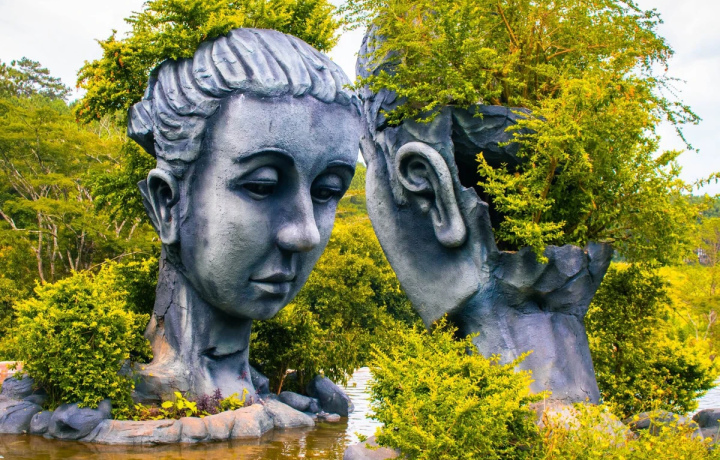 Главная фотозона Далата с монументальными каменными головами влюблённых над зеркальной гладью воды. Ранний визит позволит сделать отличные кадры без толпы туристов.